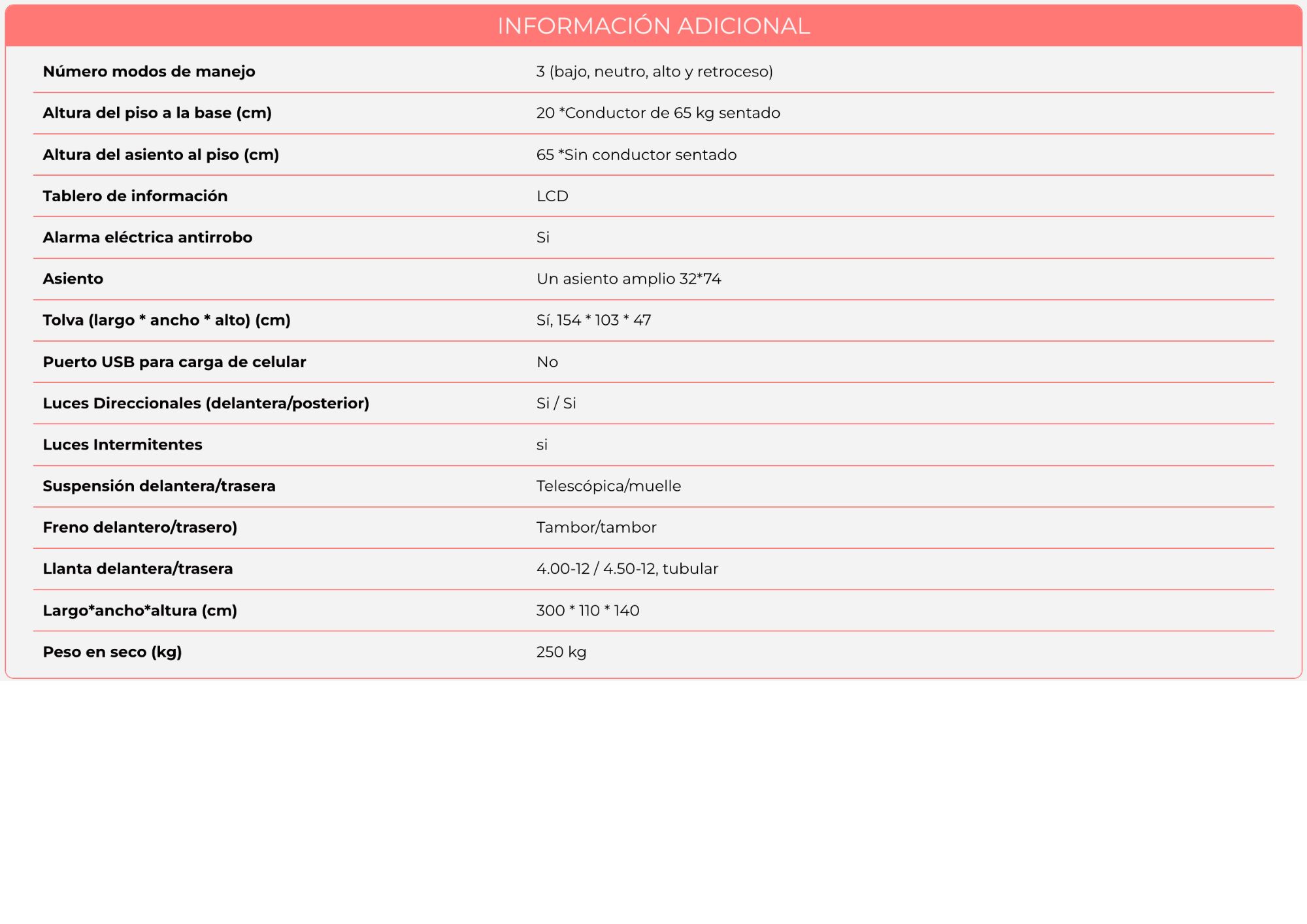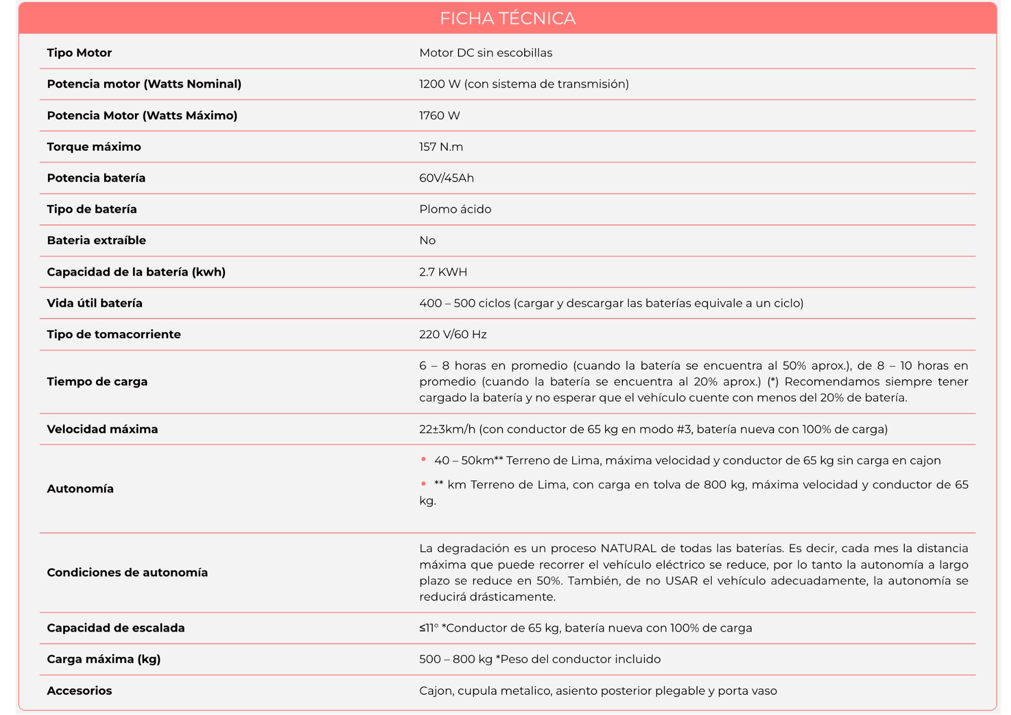 Batería de Plomo 60V 45AH, Motor 1200W, Brindando una Velocidad de 22±3km/h, Sistema de Transmisión DUAL para Alto Torque , Luces Direccionales. Medidas de cajón 154 x 103 x 47 cm, capacidad de carga de 800kg