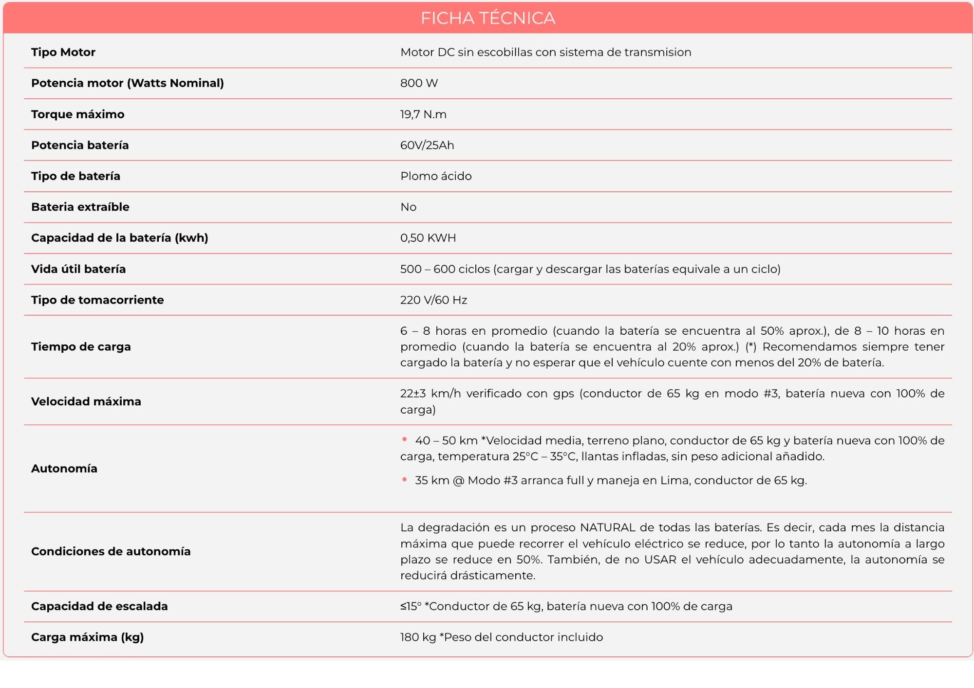Esta trimoto eléctrica con techo está diseñada para ofrecerte protección, comodidad y practicidad en todo momento. Equipada con una batería de plomo-ácido de 60V 25AH y un motor de 800W, alcanza una velocidad máxima de 22 ± 3 km/h y brinda una autonomía de 40 a 50 km por carga, ideal para desplazamientos urbanos y paseos prolongados.