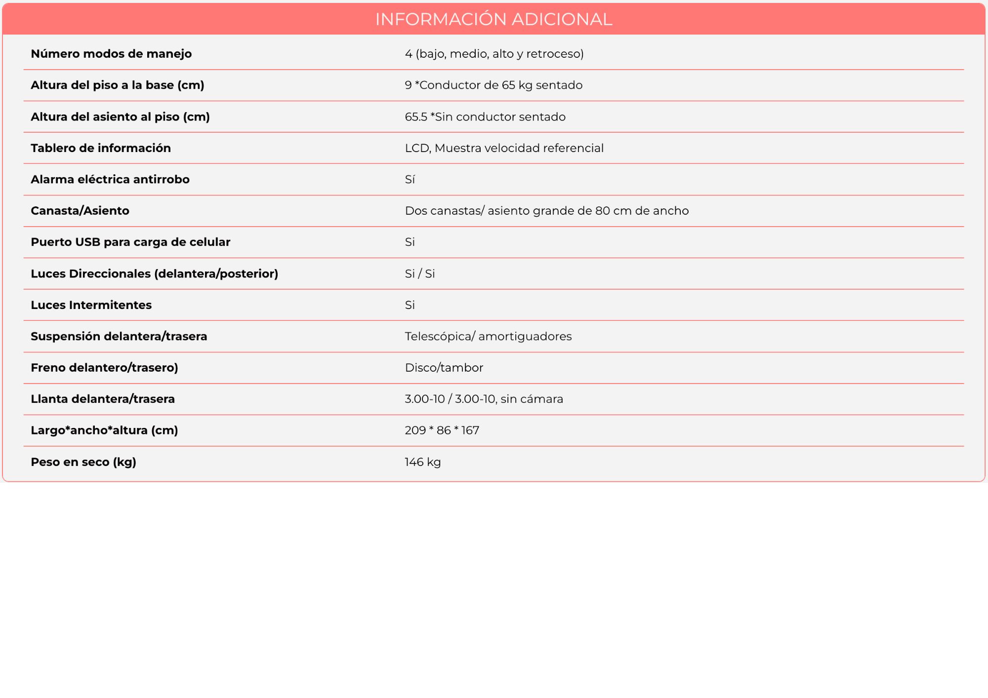 Para tu tranquilidad, incluye alarma eléctrica antirrobo con bloqueo de motor, freno de pie y freno de mano con sistema antideslizante, además de una transmisión optimizada para alto torque. Sus llantas 3.0-10 ofrecen excelente estabilidad en todo tipo de terreno, mientras que las luces direccionales garantizan una conducción más segura.