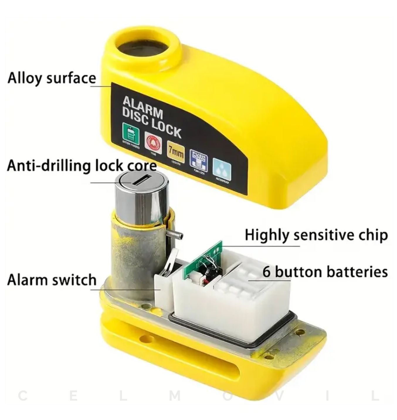 Candado de Freno Disco con Alarma, con Su diseño práctico garantiza un funcionamiento sencillo, mientras que su resistencia al agua lo hace perfecto para cualquier condición climática.