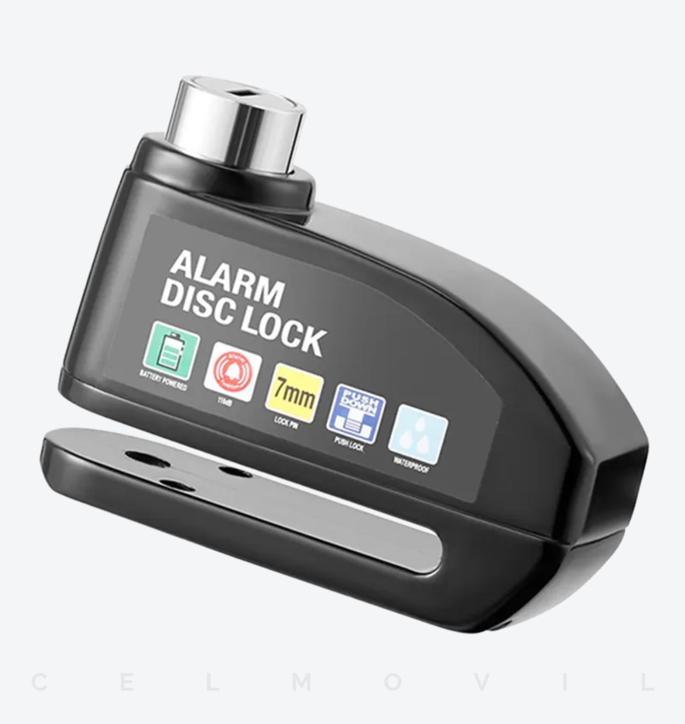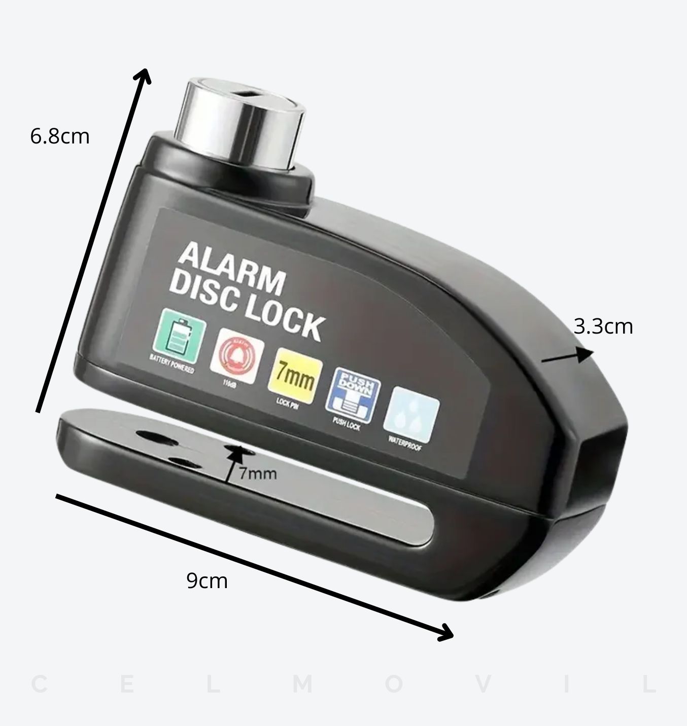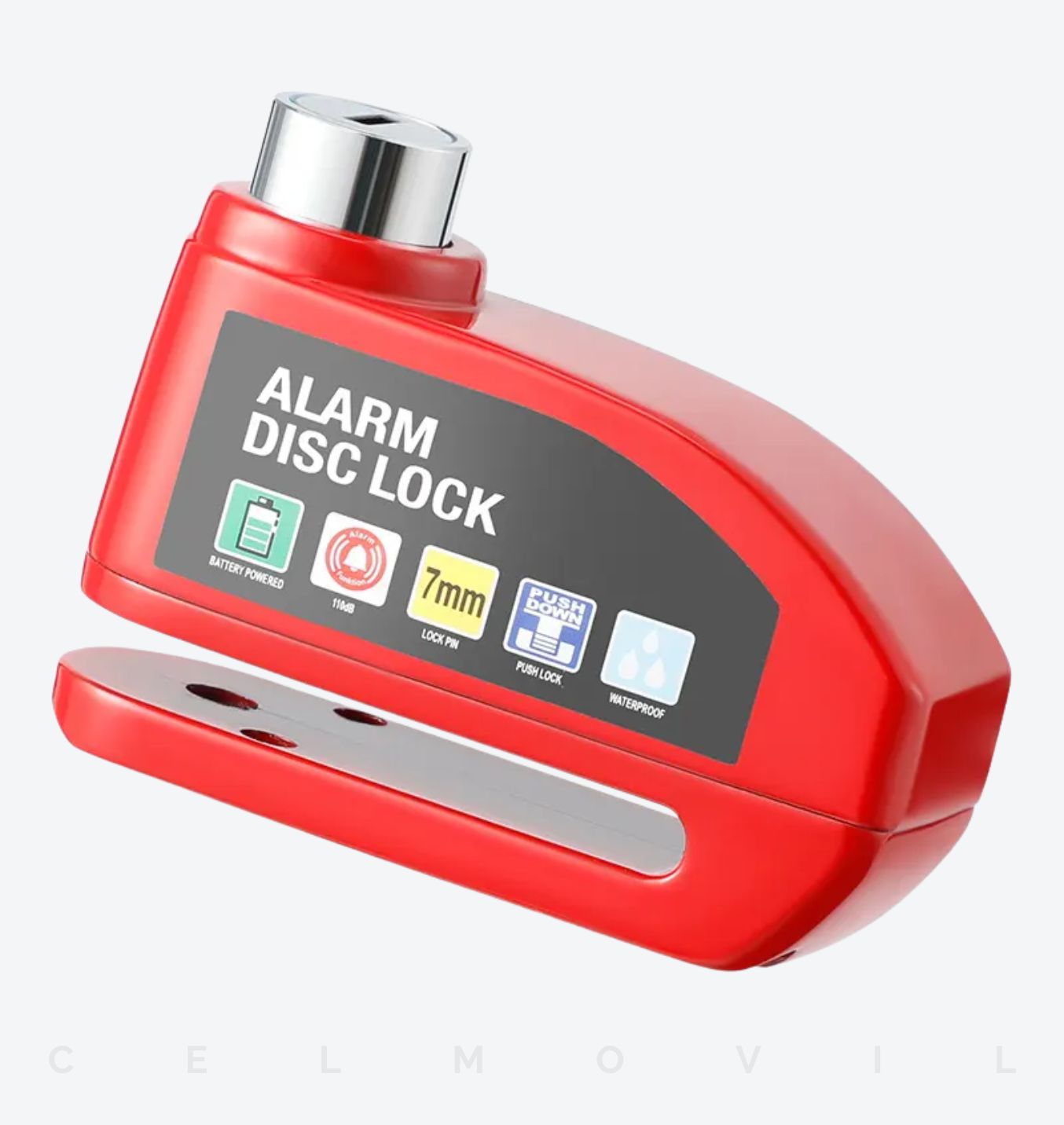 Candado para freno de disco con Alarma Electrica antirrobo para motos, moto electrica, o Bicicleta. De funcionamiento sencillo, ademas es aprueba de agua, cuenta con Push Lock, Alarma de 110dB y Lock Pin de 7mm.