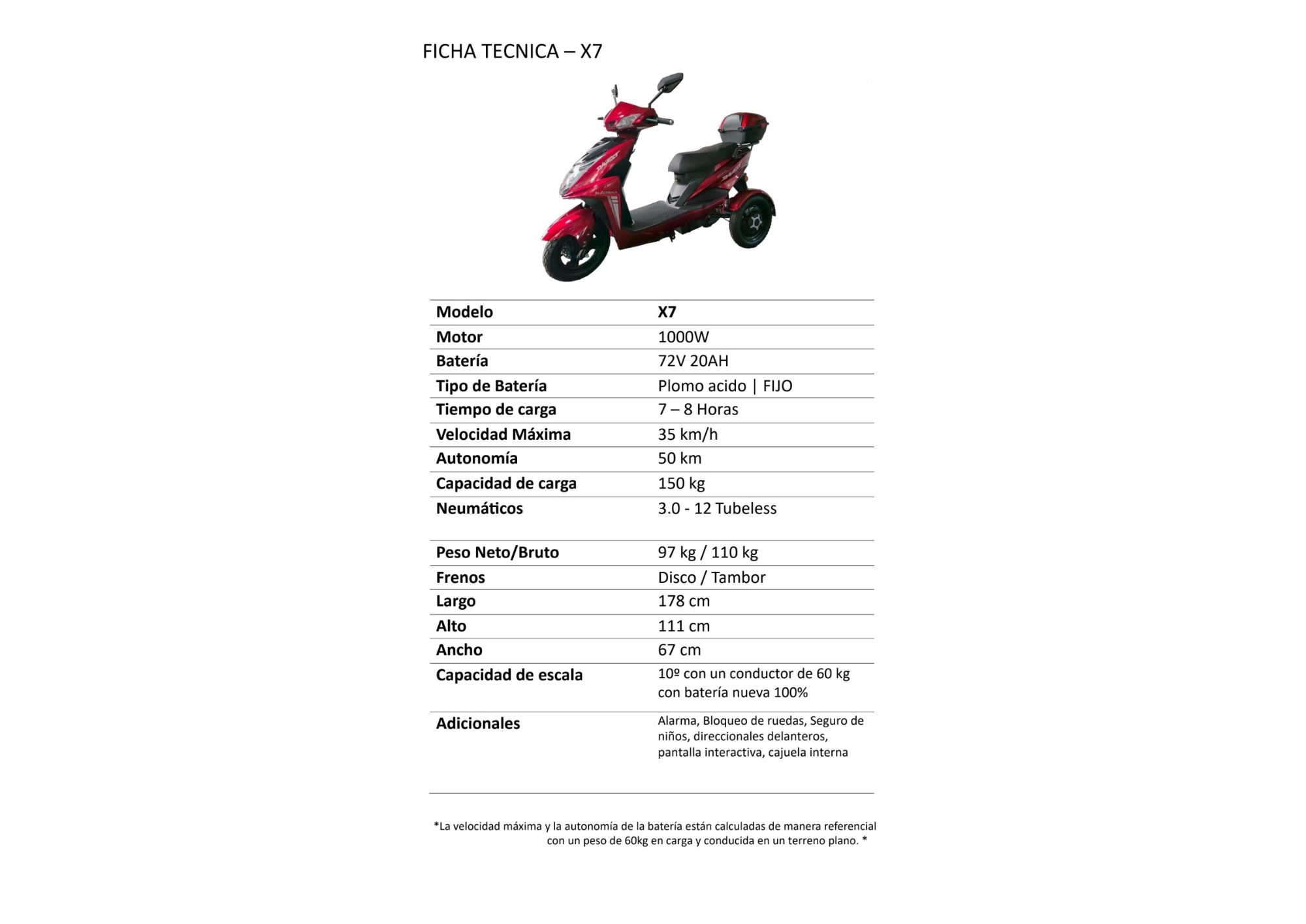 La Trimoto X7 es práctico, seguro y eficiente, diseñada para el día a día en la ciudad. Equipada con un motor de 1000W y batería de 72V 20Ah, ofrece hasta 50 km de autonomía y una velocidad máxima de 35 km/h, ideal para traslados urbanos con comodidad.