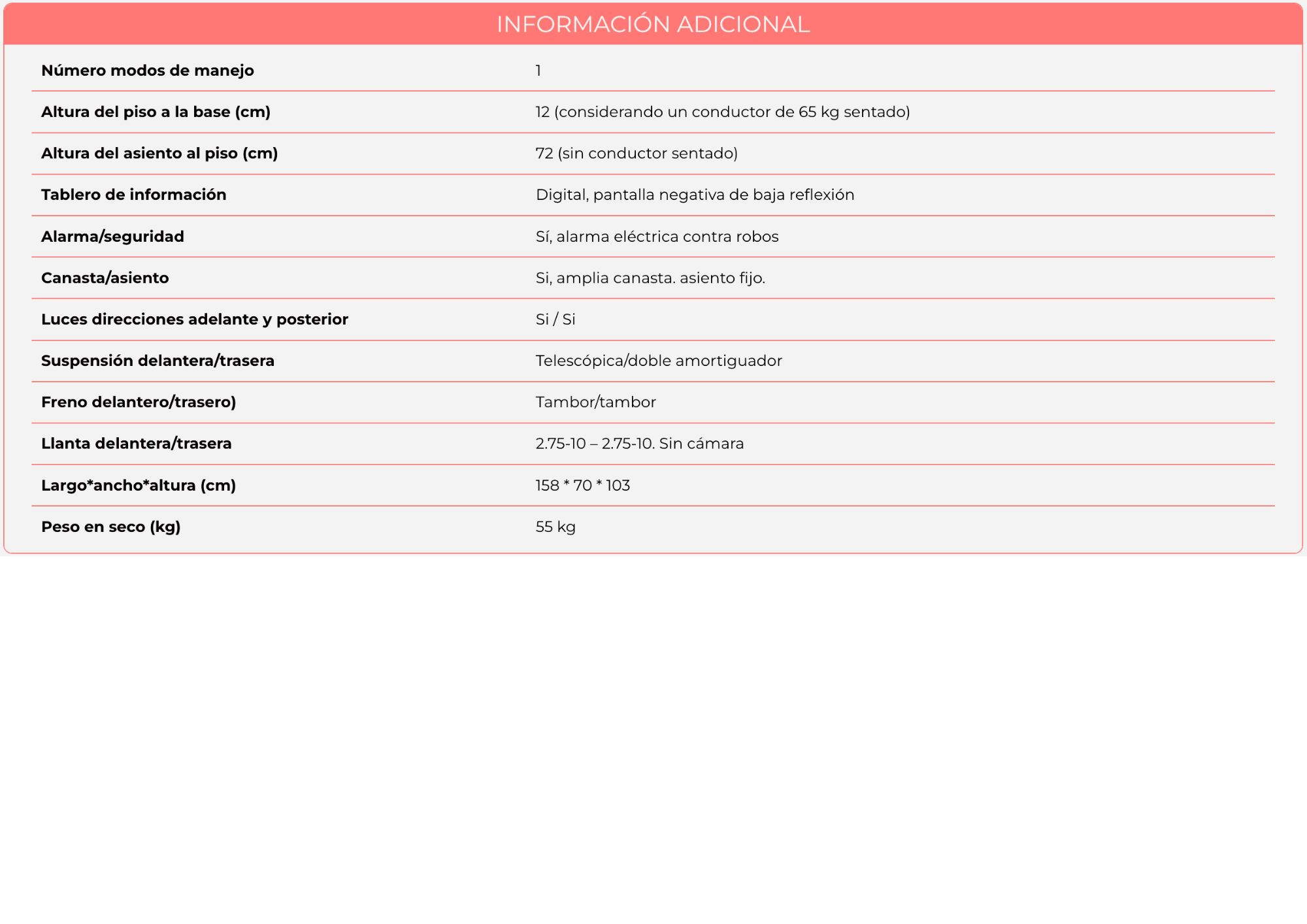 Está equipado con una batería de litio de 48V24AH (no extraíble) y un motor de 500W, que le permiten alcanzar una velocidad máxima de 22±3 km/h (verificada con GPS), con opción de velocidad crucero y una autonomía promedio de 60 a 70 km.