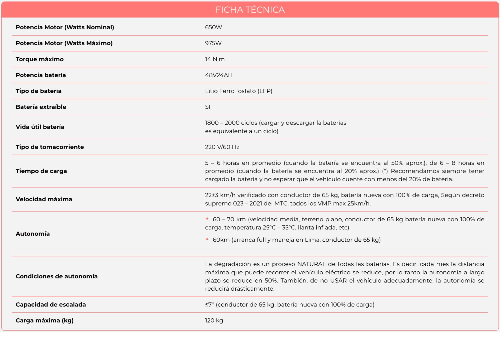 Equipada con batería de litio Ferro fosfato (LFP) extraíble de 48V24AH y un motor de 650W, alcanza una velocidad promedio de 22±3 km/h y ofrece una autonomía de 60 a 70 km por carga.