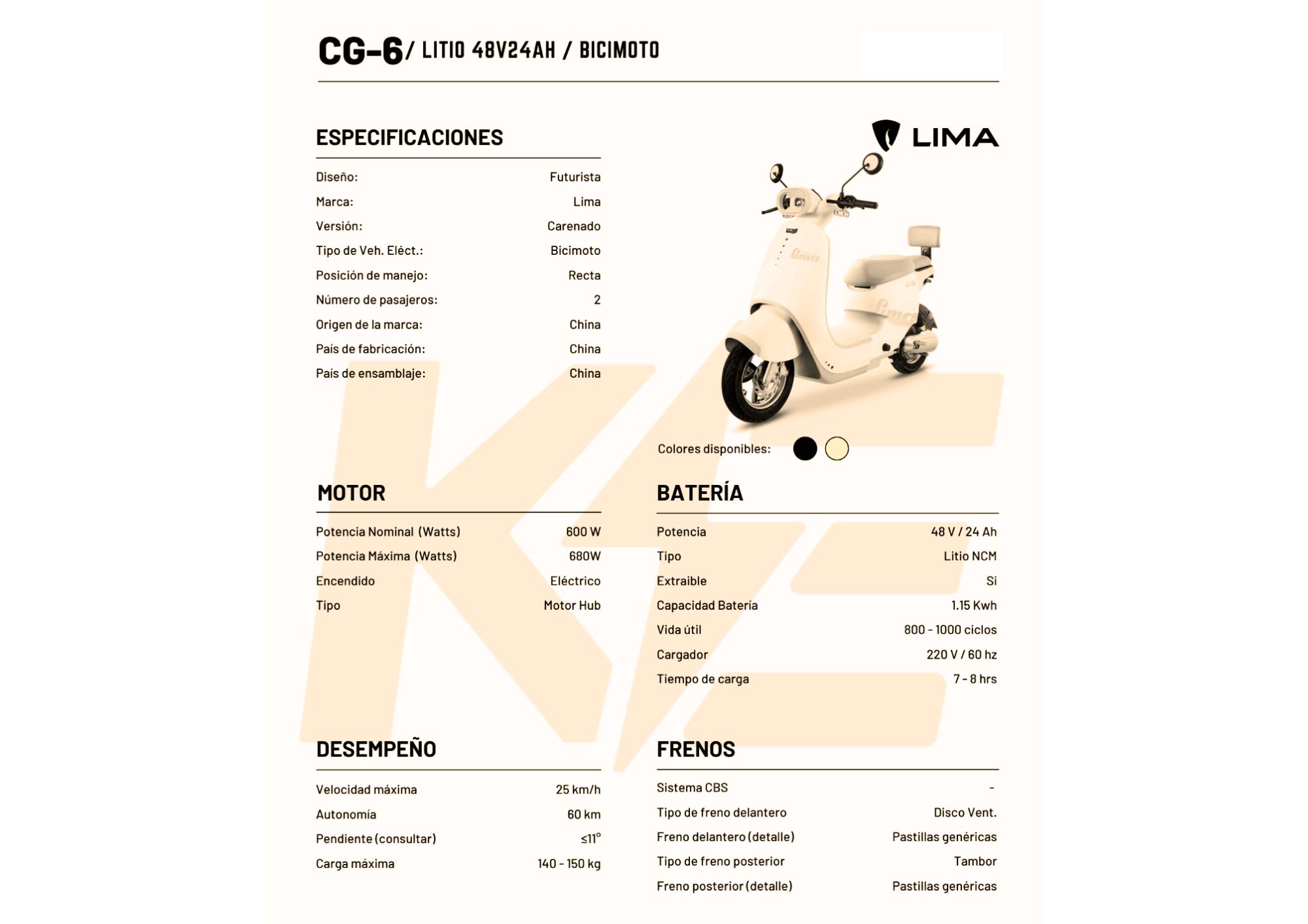 Batería de Litio Extraíble 48V24AH, Motor 600W, Velocidad máx. 25km/h, Autonomía 60 – 80 km, Bloqueo de Motor, Alarma.