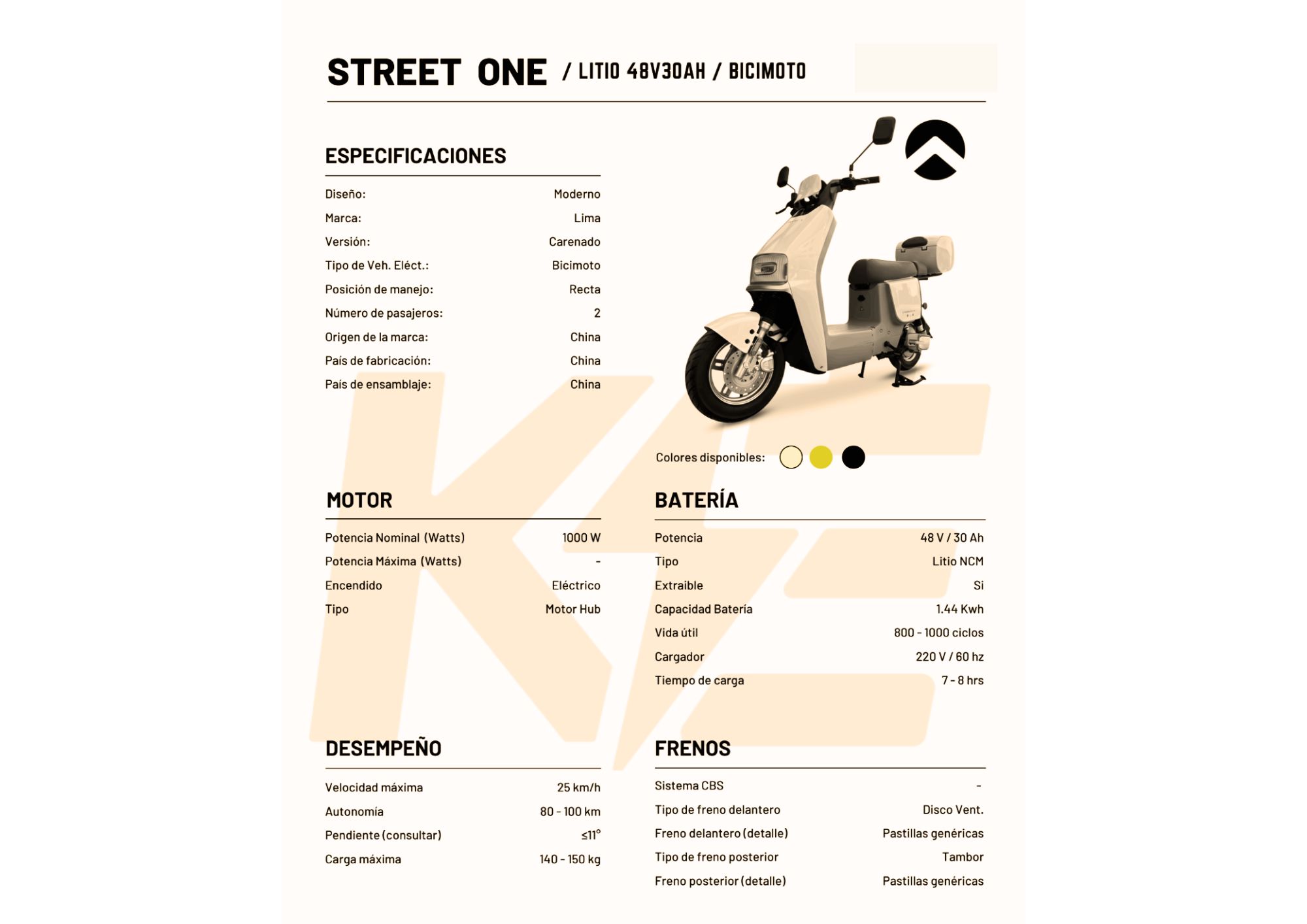 Batería de Litio Extraíble 48V30AH, Motor 1000W, Velocidad máx. 25km/h, Autonomía 90 – 100 km, Bloqueo de Motor, Alarma. Es una bicimotos con excelentes prestaciones. Su batería extraíble de la marca Phylion ofrece seguridad y tranquilidad en su conducción.