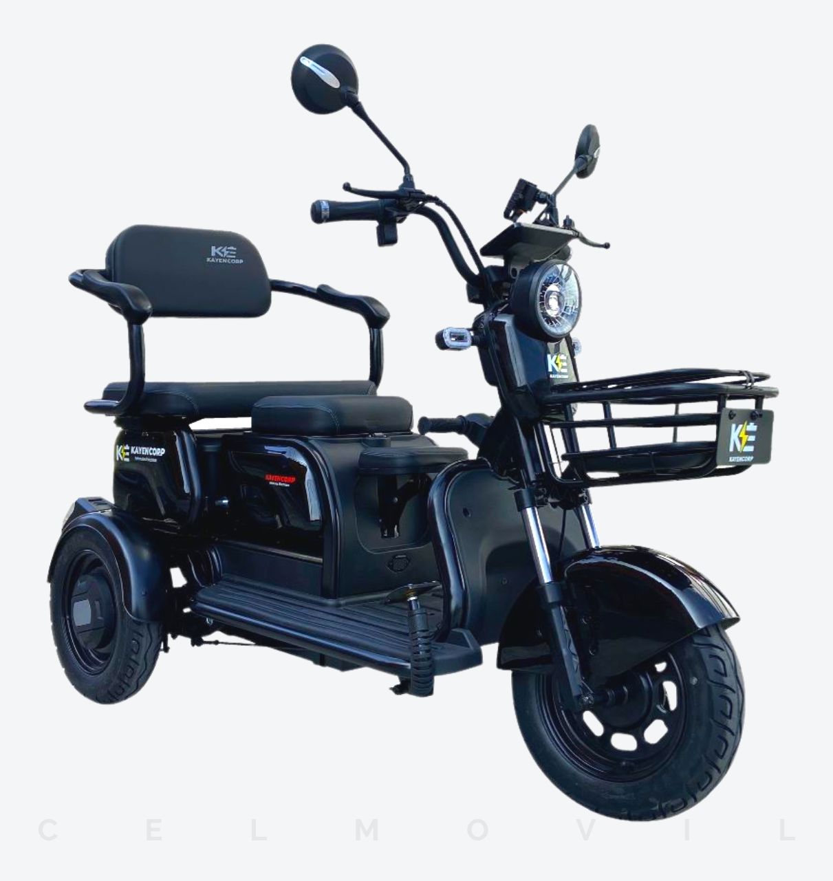 Trimoto de paseo, con batería de LITIO FERROFOSFATO – LifePO4, 48V24AH (Vida útil de hasta 5 años), motor 800W, 2 asientos transformables; Aro de 10 y llanta 3.0-10, Mas alto; freno de mano anti-deslizar, luz intermitente, luz direccional, función Retroceso.
