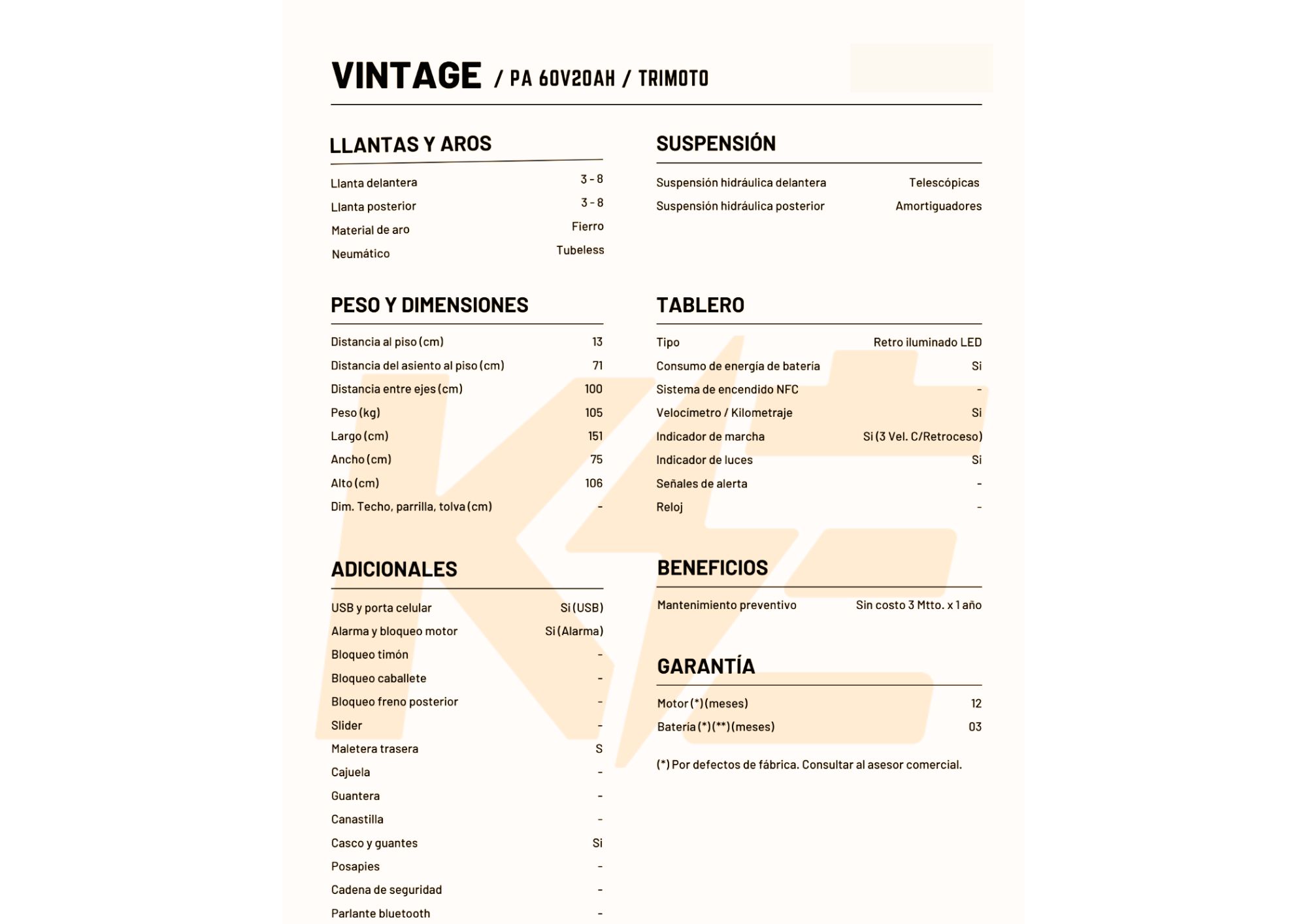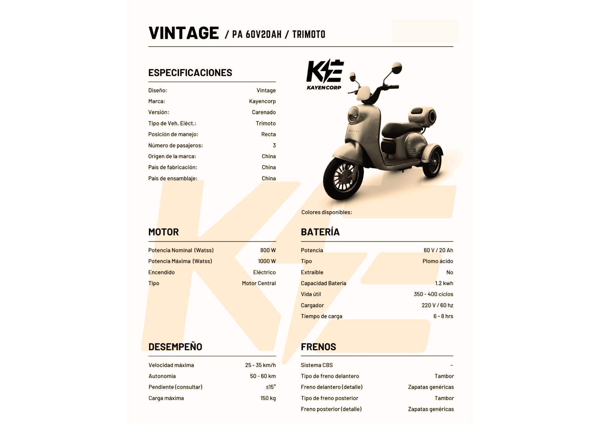 Trimoto estilo vintage de paseo, con batería de Plomo acido, 60V20AH, velocidad 30km/h, motor 800W, asiento grande con diseño; Aro de 10 y llanta 3.0-10, Mas alto; freno de pie, luz intermitente, luz direccional, función Retroceso, Cajuela.