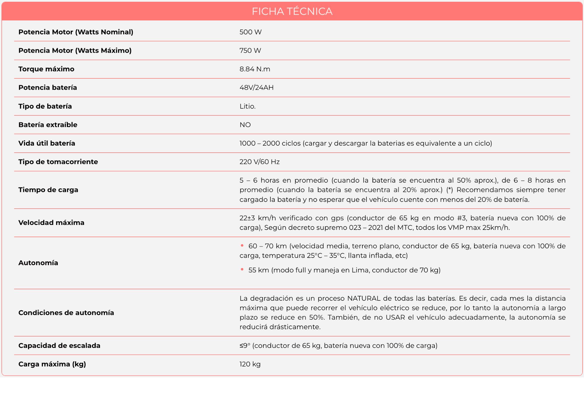 Está equipado con una batería de litio de 48V24AH (no extraíble) y un motor de 500W, que le permiten alcanzar una velocidad máxima de 22±3 km/h (verificada con GPS), con opción de velocidad crucero y una autonomía promedio de 60 a 70 km.