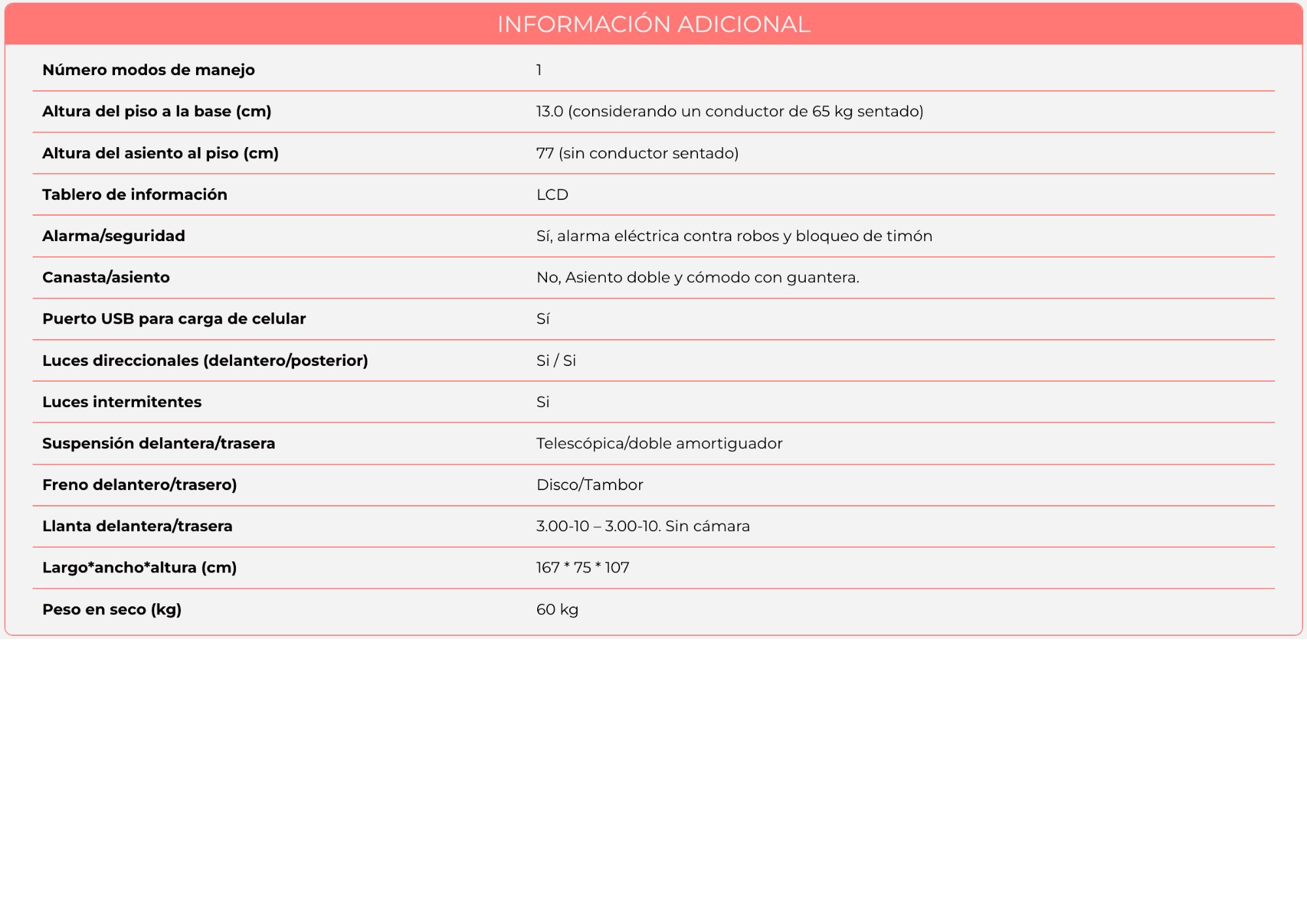 Además, cuenta con accesorios adicionales que elevan la experiencia de uso: Puerto USB para cargar dispositivos, Guantera en el timón y gancho multiusos, Doble asiento cómodo y maletera trasera de gran capacidad, Potente bocina, control inalámbrico y dos llaves de seguridad.