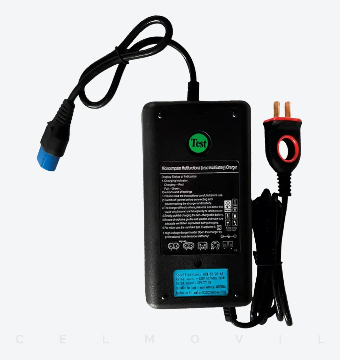 Cargador con puerto TAILG para las moto eléctrica con batería de plomo ácido 60V20AH, o plomo con tecnologia grafeno 60V22AH, de la marca TAILG; y tambien para GreenLine M6, M5, E3, E5.