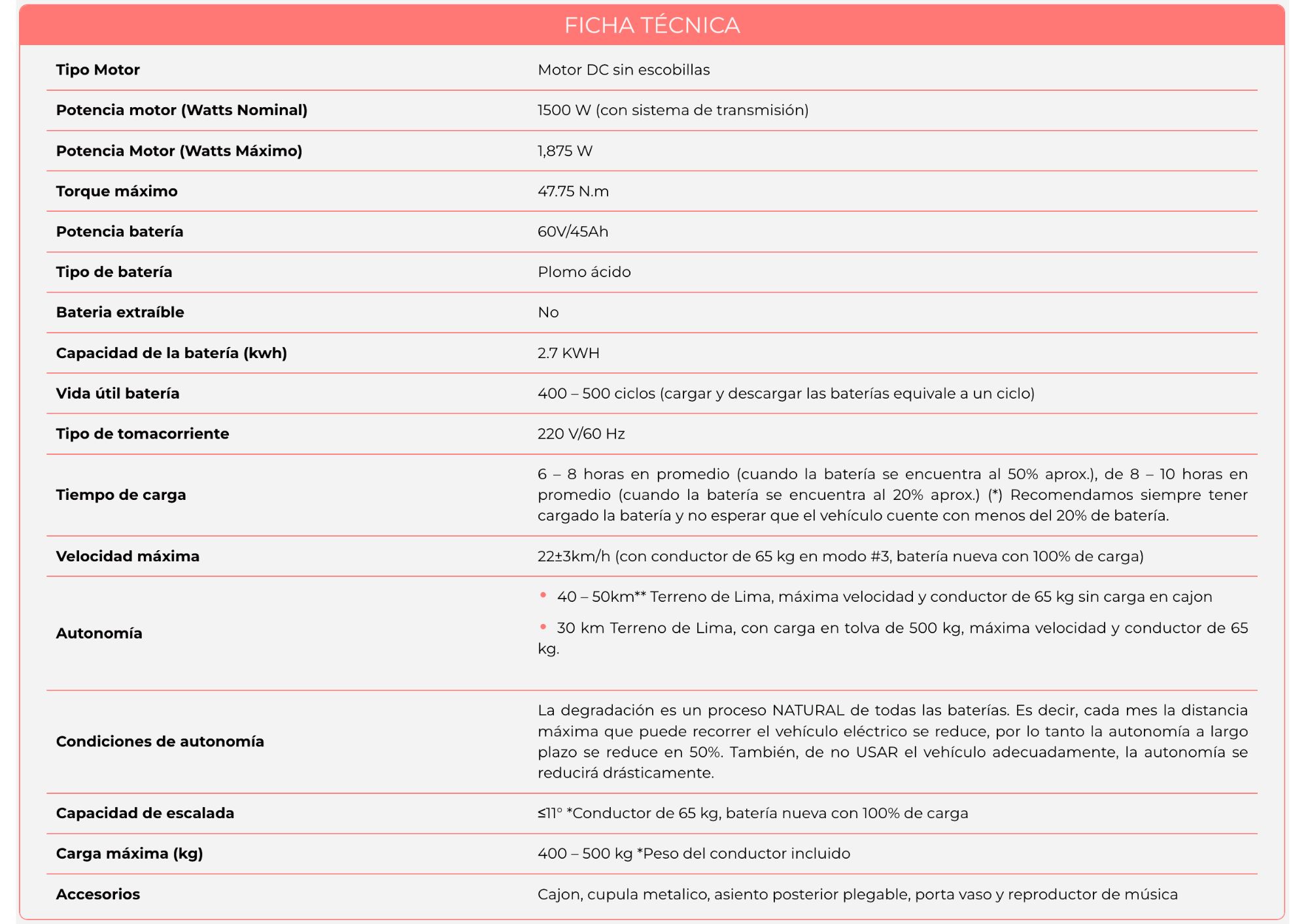 Batería de Plomo 60V 45AH, Motor 1500W, Brindando una Velocidad de 22±3km/h, Sistema de Transmisión DUAL para Alto Torque , Luces Direccionales. Medidas de cajón 154 x 103 x 47 cm, capacidad de carga de 500kg