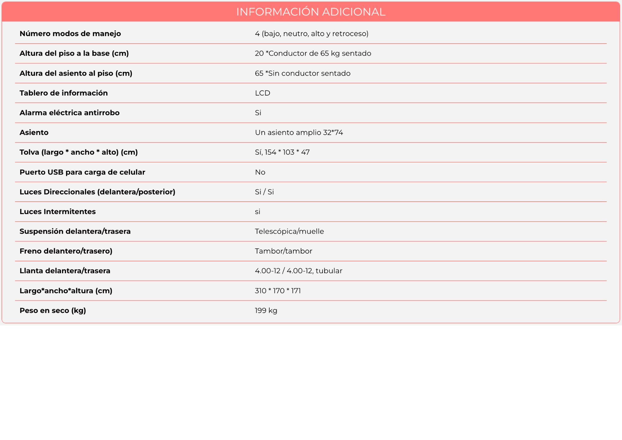 Características a destacar tiene función de retroceso, freno de pie, freno de mano, freno de mano de tipo palanca, velocidades alta, neutro y baja. Además, como muchos de nuestros vehículos viene con luces direccionales para que los demás conductores puedan anticipar tus movimientos al conducir y en esta versión abierta se le incorpora un reproductor de música.