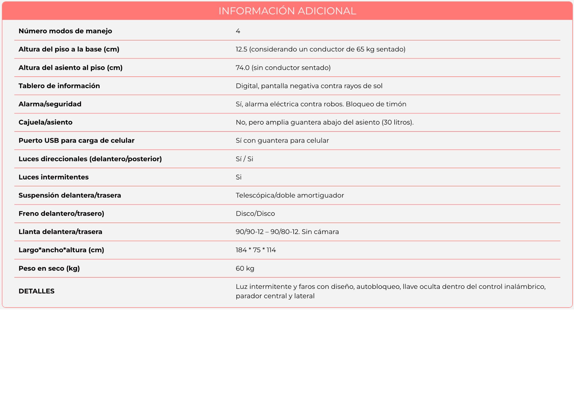Equipada con un motor de ahora 1500W y una batería de plomo-ácido con grafeno 72V 26AH, alcanza una velocidad máxima de 50 km/h y una autonomía de 50 a 60 km por carga. Cuenta con llantas 90/90-12 delantera y 90/80-12 posterior con sistema de autobloqueo sin llave, doble freno de disco para mayor seguridad y una pantalla digital avanzada que muestra el porcentaje de carga de la batería con precisión.