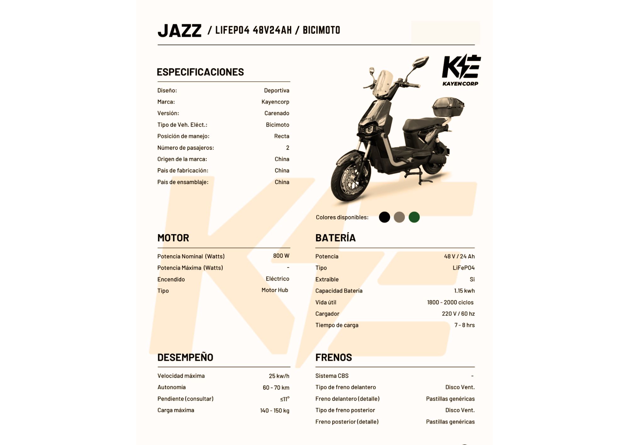 Batería de Litio LF4 Extraíble 48V24AH, Motor 800W, Velocidad máx. 35km/h, Autonomía 60 – 80 km, Bloqueo de Motor, Alarma.