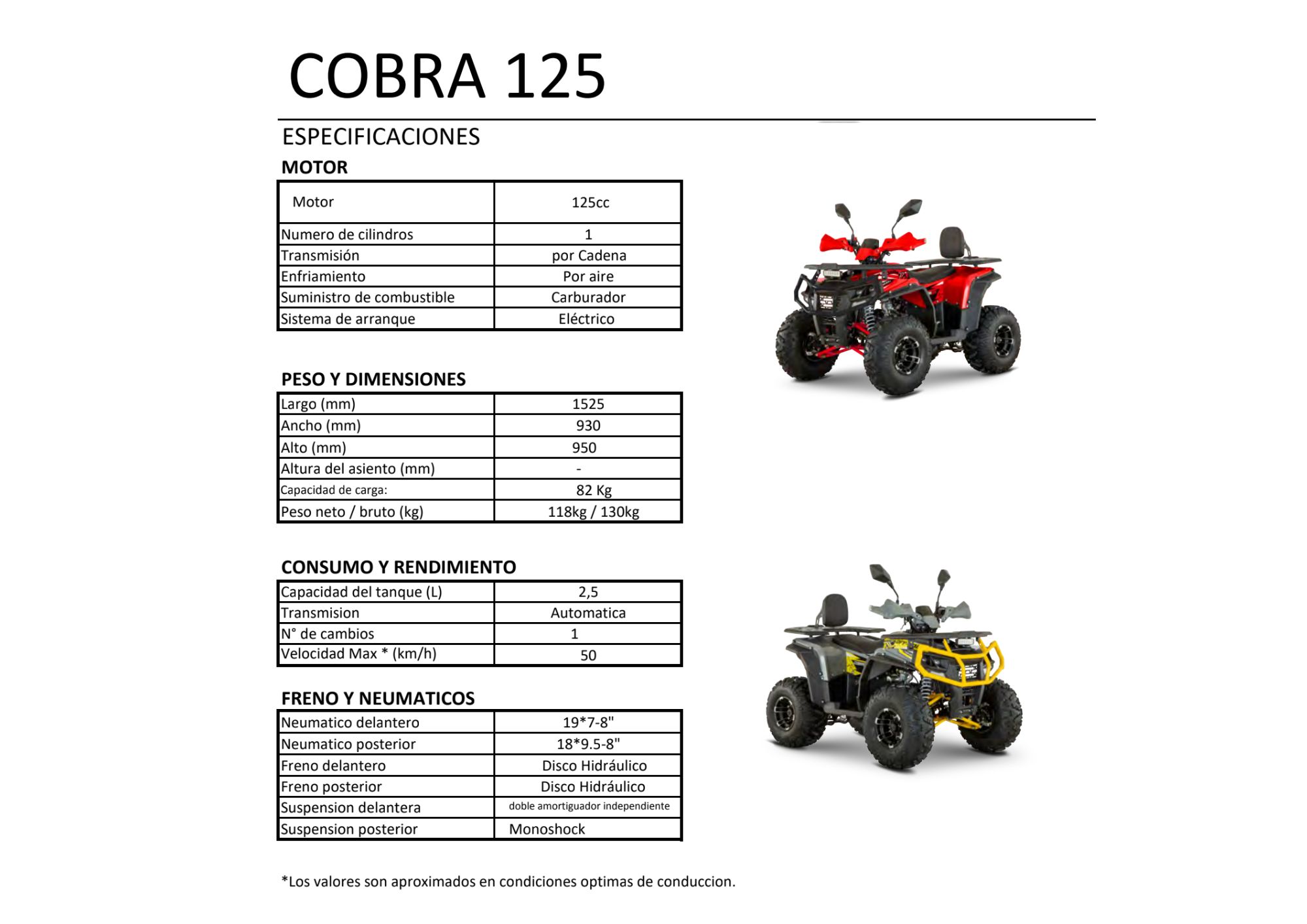 De estilo agresivo, parachoques de alta resistencia, parrillas utilitarias. Motor 4t de 125cc con una transmisión automática por cadena con retroceso. Está construida de acero resistente con suspensión independiente y frenos de disco. Además, con tablero digital, luces LED.