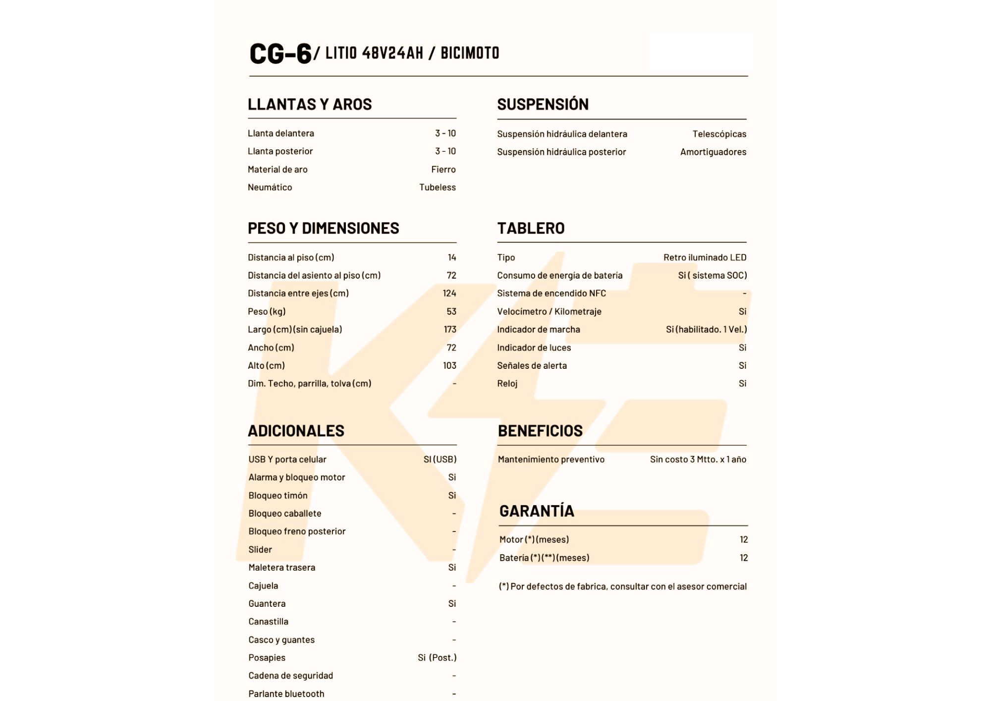 Batería de Litio Extraíble 48V24AH, Motor 600W, Velocidad máx. 25km/h, Autonomía 60 – 80 km, Bloqueo de Motor, Alarma.