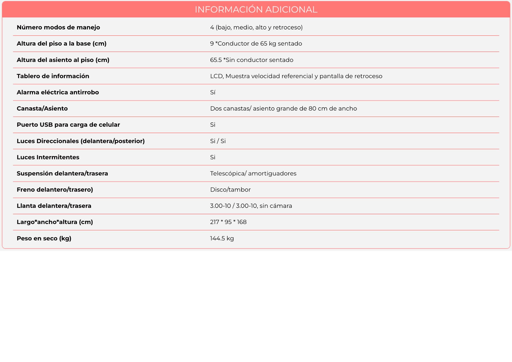 Trimoto de paseo, Batería de Plomo Grafeno 60V23AH, Motor 800W, velocidad 25km/h y rinde autonomia de 50km, capacidad de carga 180kAsientos grandes, Freno de Pie, Disco de freno delantero, Freno de Mano Anti-Deslizar, Luz Intermitente, Luz Direccional, Función Retroceso con camara. Incluye ROOSTER
