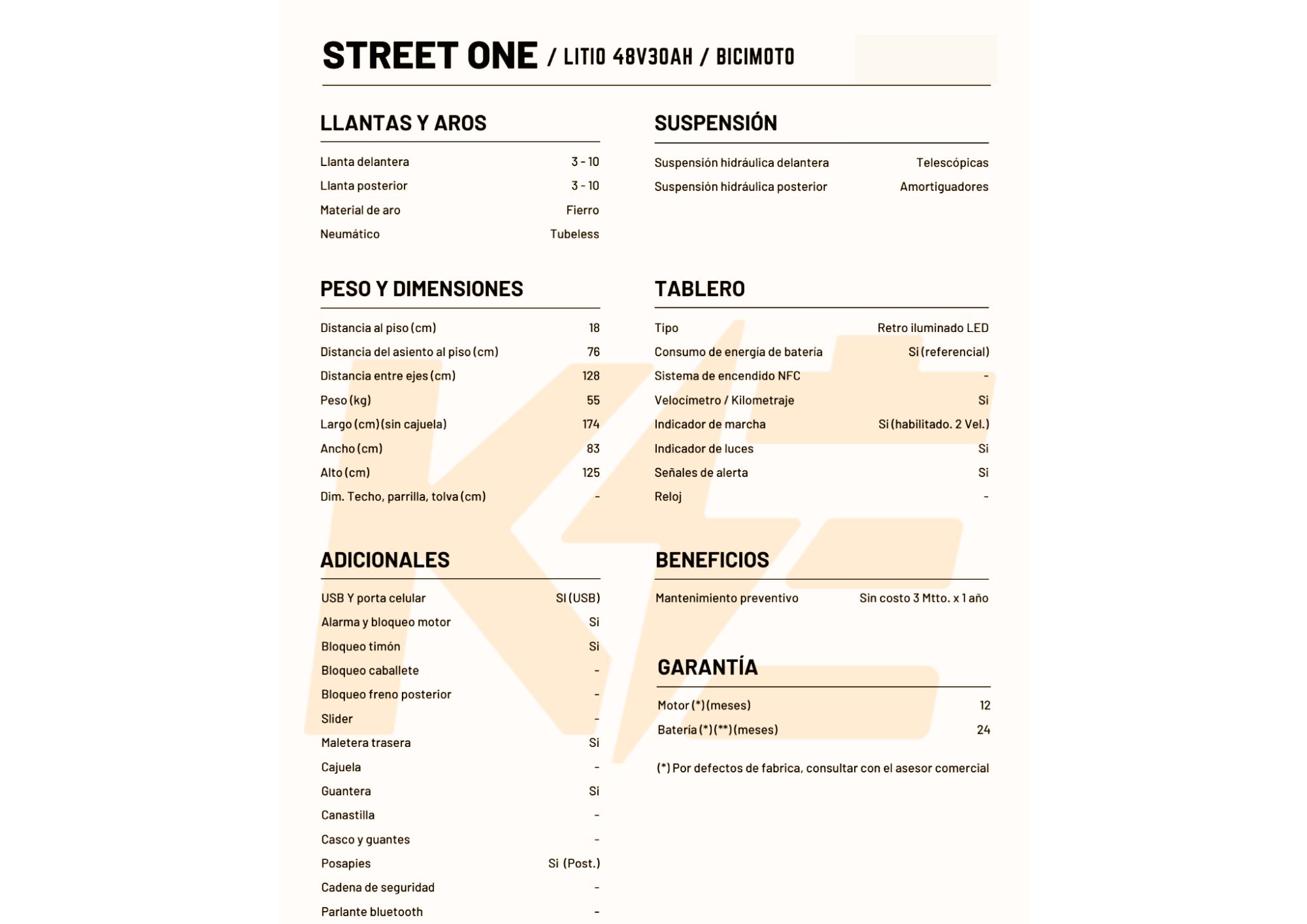 Batería de Litio Extraíble 48V30AH, Motor 1000W, Velocidad máx. 25km/h, Autonomía 90 – 100 km, Bloqueo de Motor, Alarma.