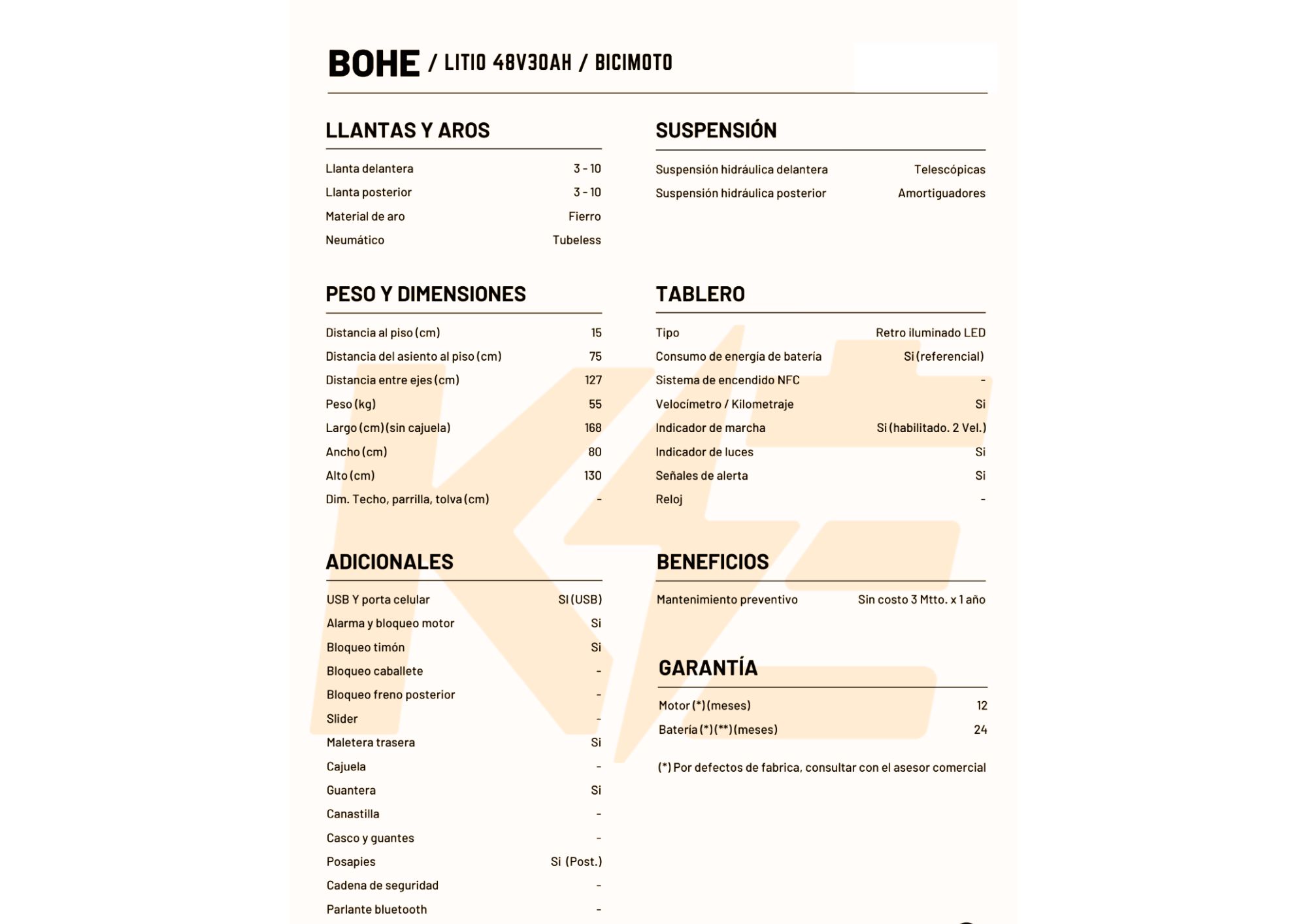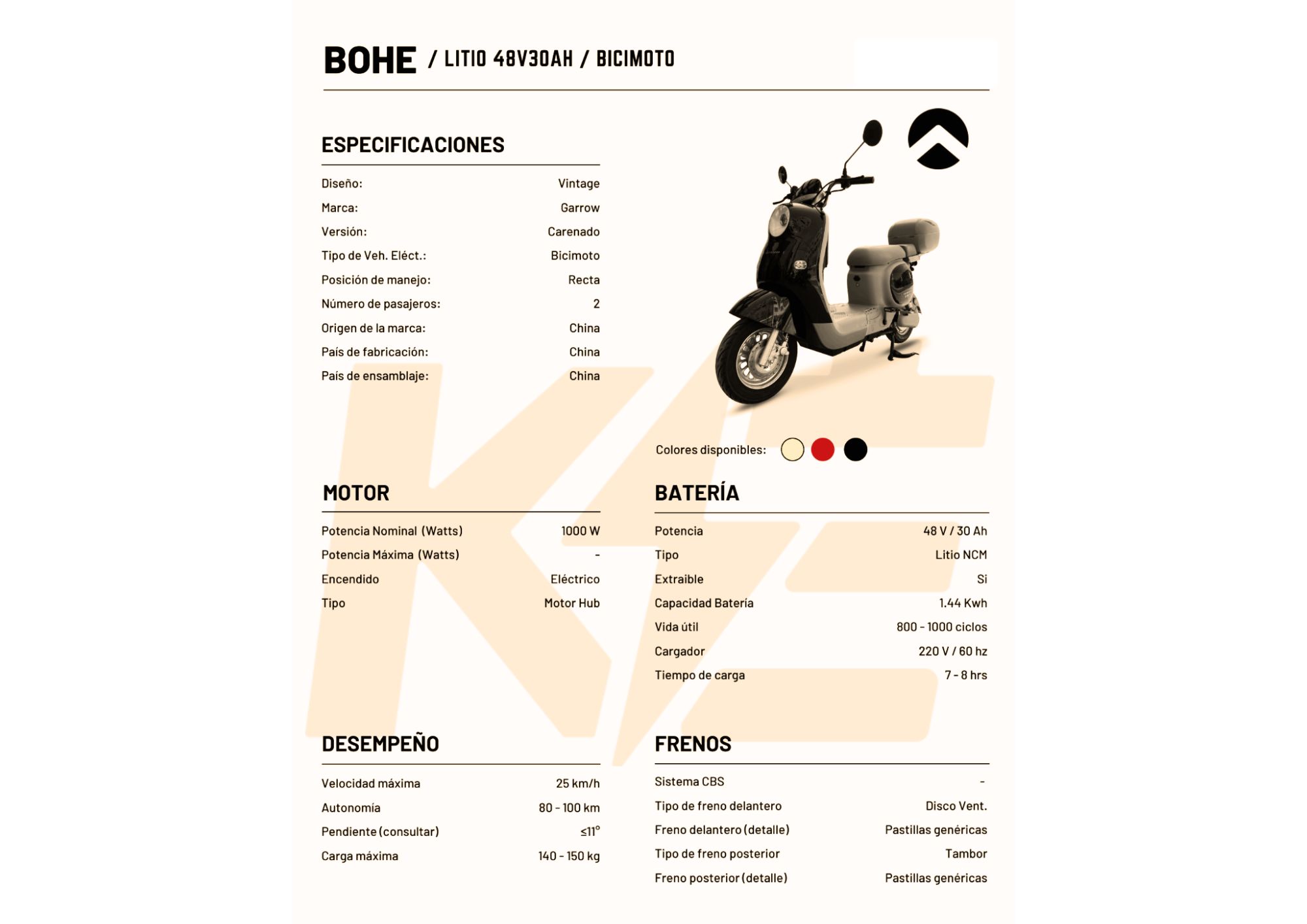 Batería de Litio Extraíble 48V30AH, Motor 1000W, Velocidad máx. 25km/h, Autonomía 90 – 100 km, Bloqueo de Motor, Alarma.