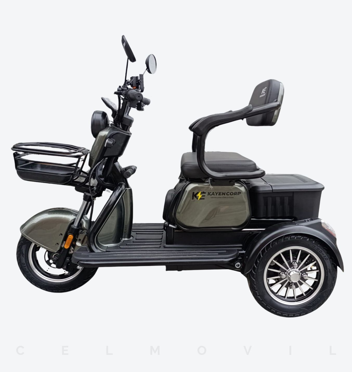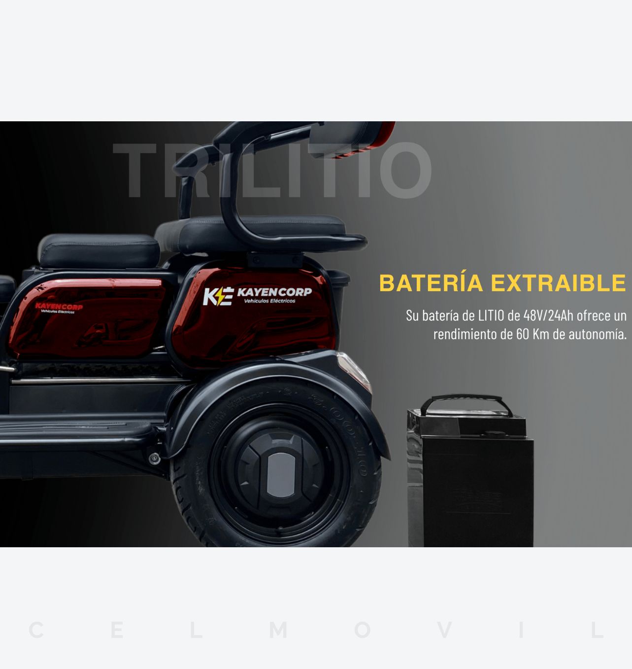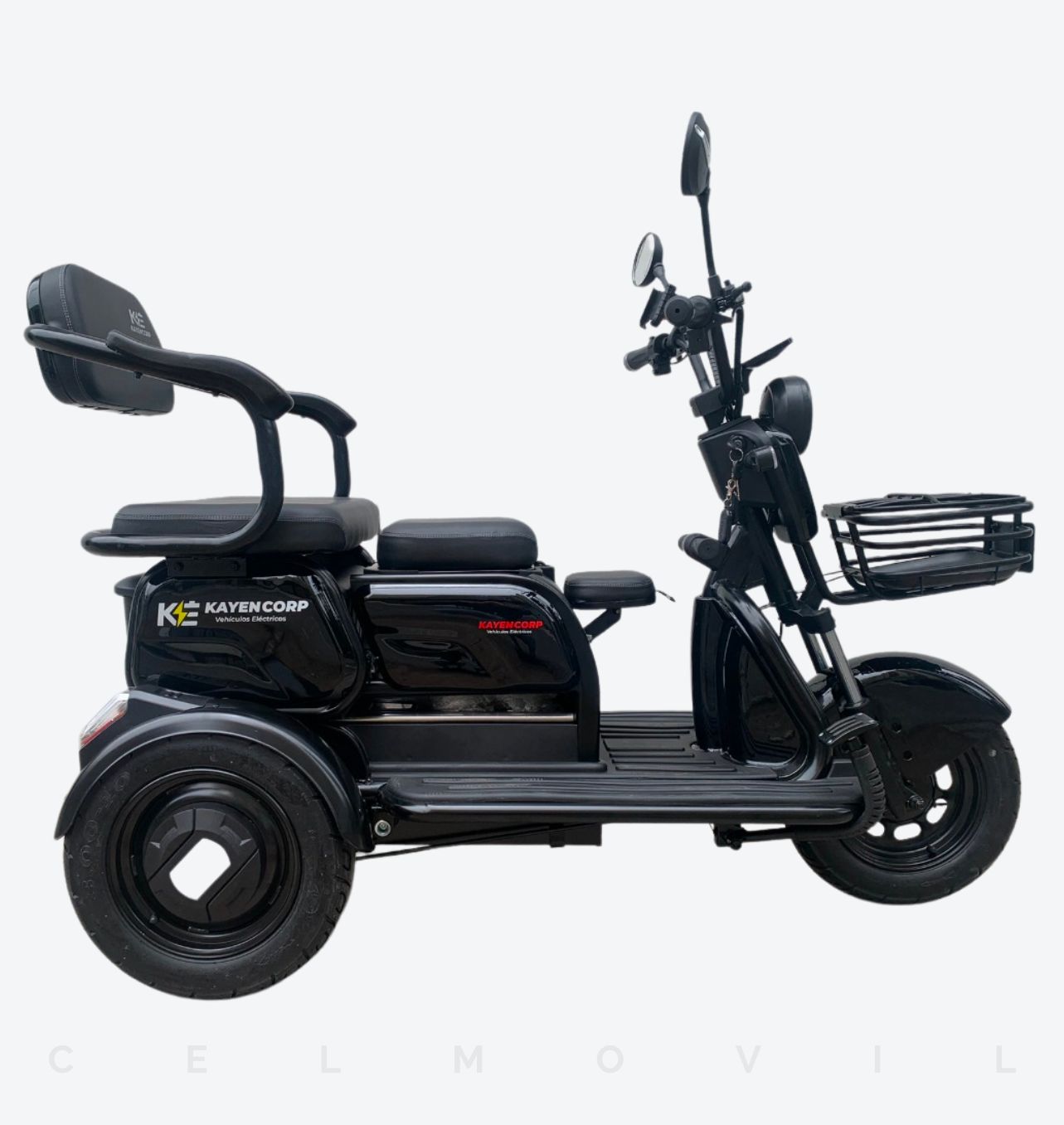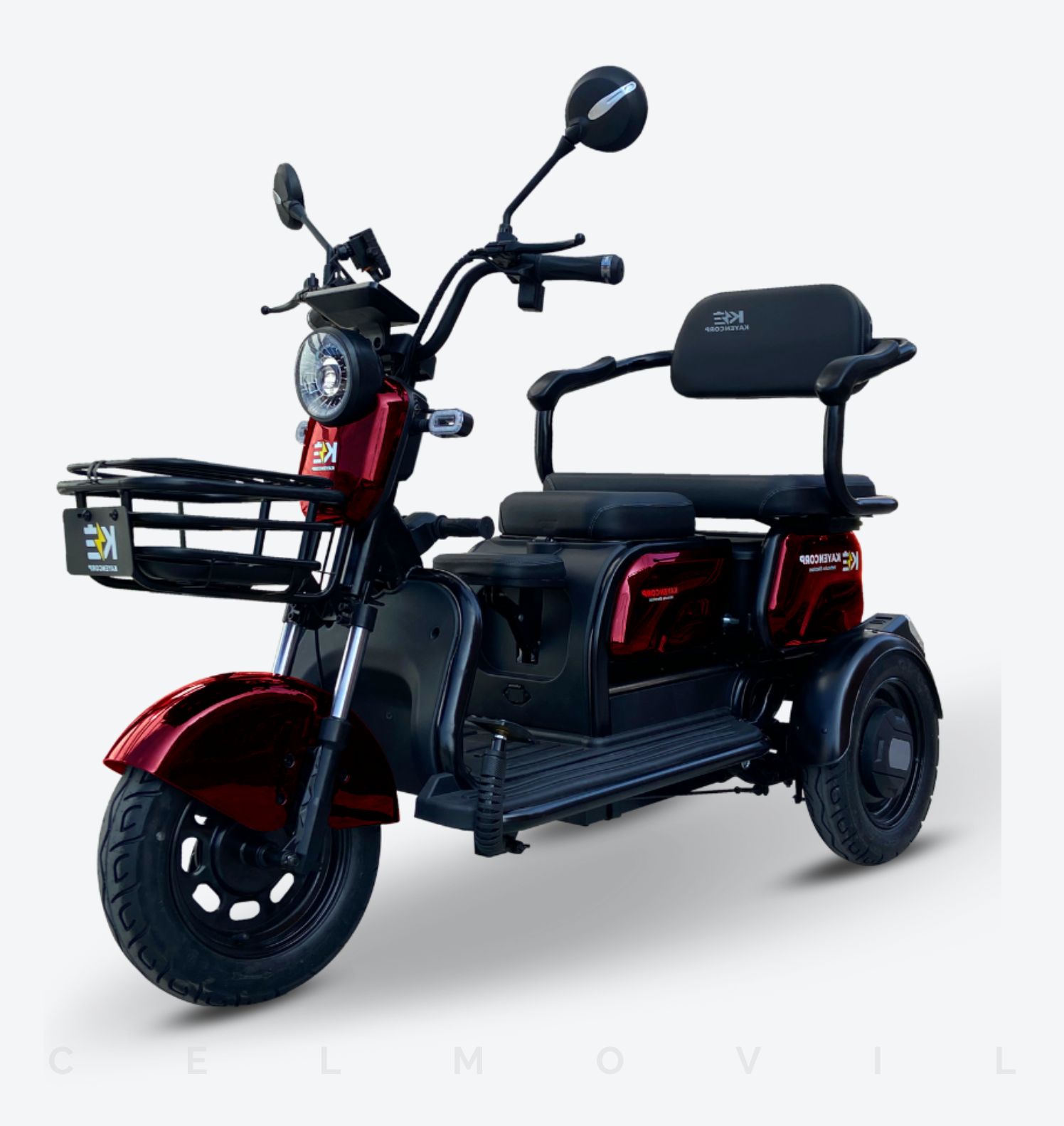 Trimoto de paseo, con batería de LITIO FERROFOSFATO – LifePO4, 48V24AH (Vida útil de hasta 5 años), motor 800W, 2 asientos transformables; Aro de 10 y llanta 3.0-10, Mas alto; freno de mano anti-deslizar, luz intermitente, luz direccional, función Retroceso.